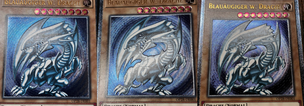 まず、こちらはドイツ版の弱めの個体です。ここで見るべきは右半分です。ほかの言語もそうなのですが、青眼はどれも左半分は加工が強いのですが、右側に加工差が集中しています。